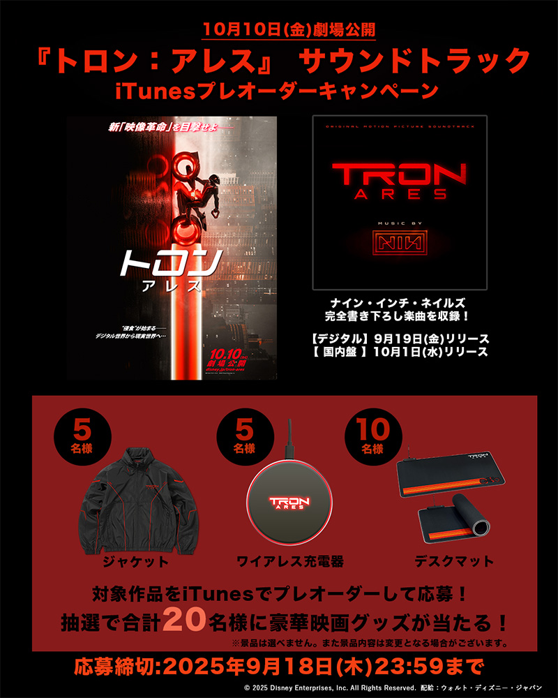10/10(金)日米同時公開の映画『トロン:アレス』。映画公開に先駆け、Nine Inch Nails(ナイン・インチ・ネイルズ)による完全書き下ろしの楽曲を収録したオリジナル・サウンドトラックが9月19日にデジタルリリース!これを記念して、対象作品をプレオーダーしていただいた方の中から抽選で合計20名様に、映画オリジナルグッズをプレゼントします!