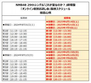 NMB48 29thシングル『これが愛なのか?』(劇場盤)発売記念オンライン個別お話し会におきまして、坂田心咲が体調不良のため、2024年8月31日(土)と2024年9月1日(日)開催分を欠席とさせていただきました。