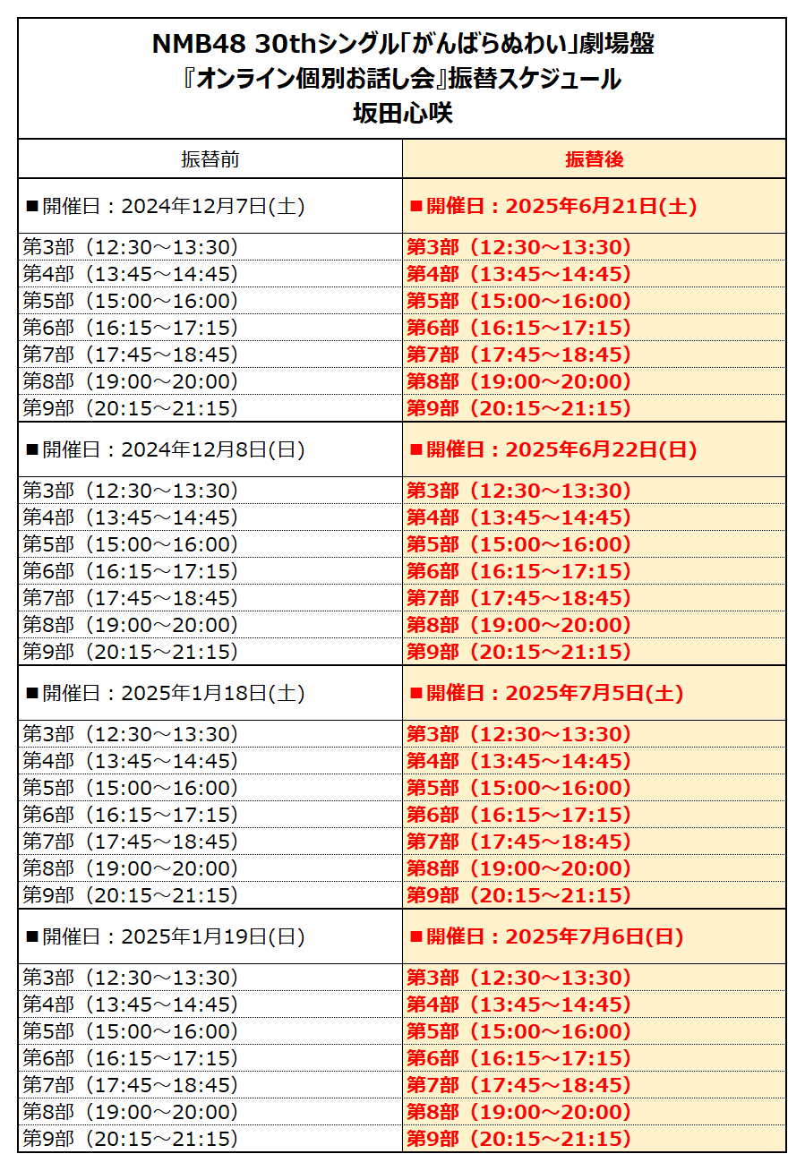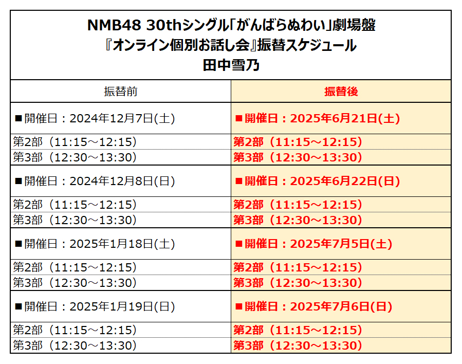 NMB48 30thシングル『がんばらぬわい』(劇場盤)発売記念オンライン個別お話し会におきまして、田中雪乃、坂田心咲が休業のため2024年12月7日(土)、12月8日(日)、2025年1月18日(土)、1月19日(日)開催分を欠席とさせていただきました。