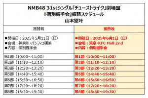 NMB48 31stシングル発売記念『チューストライク』劇場盤 個別握手会におきまして、山本望叶が体調不良のため、2025年5月11日(日)開催分を欠席とさせていただきました。
