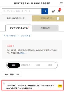 ■『オンライン個別お話し会』の参加に必要な「イベント日程毎のURL・会員ID・パスワード」は、各イベント開催数日前にUNIVERSAL MUSIC STORE / ANNEXログイン後の【マイページ】内、【お知らせ】ページにてご確認いただけます。