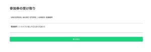 UNIVERSAL MUSIC STOREマイページへ電子チケットのご案内通知後、本文に記載の【UNIVERSAL MUSIC STORE会員番号】と【電話番号】を入力して<受け取るボタン>を押してください。