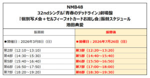 NMB48 32ndシングル発売記念『青春のデッドライン』劇場盤イベントにおきまして、池田典愛が体調不良のため、2026年3月7日(土)開催「個別握手会」、2026年3月8日(日)開催「個別写メ会+セルフィーフォトカードお渡し会」を欠席とさせていただきました。