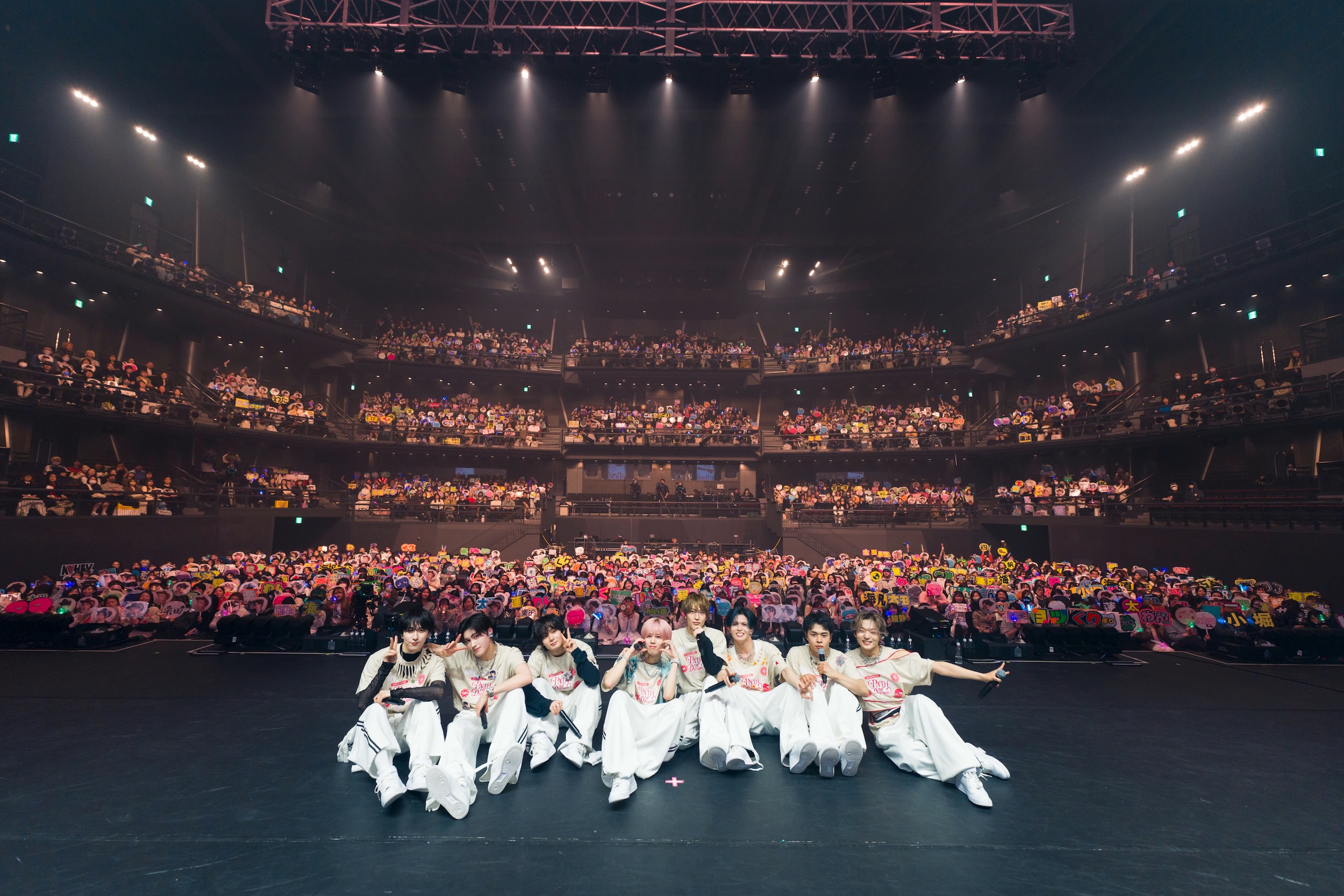 その後は、客降りをしてティッシュを配りながら『our Good Time』『FUN』を歌い、それぞれが THme への熱い想いと感謝を伝えステ ージを降りた。エンドロールが流れると、最後には、“緊急告知”という文字と共に全国ツアーの開催も発表。3 年ぶりの全国ツアー開催に この日一番の大歓声が沸き起こると、メンバーが再登場。W アンコールでは彼ら8人が初めて全員で作詞を手掛けたという未発表の楽 曲『Youʼre my path』(リリース未定)を初披露。この曲には、仲間と出会い、THme と出会い、愛をもらい、返していく彼らの愛と 夢の物語がぎゅっと詰め込まれた、まるで THme へのラブレターのよう。古瀬は歌いながら美しい涙を流し、最後には全員がそんな古瀬 を中心にぎゅっと肩を抱き合い、8 人はそれぞれ嬉しそうに「大好きだよ!」「ありがとうございました!」とめいっぱいの愛を伝えていた。
