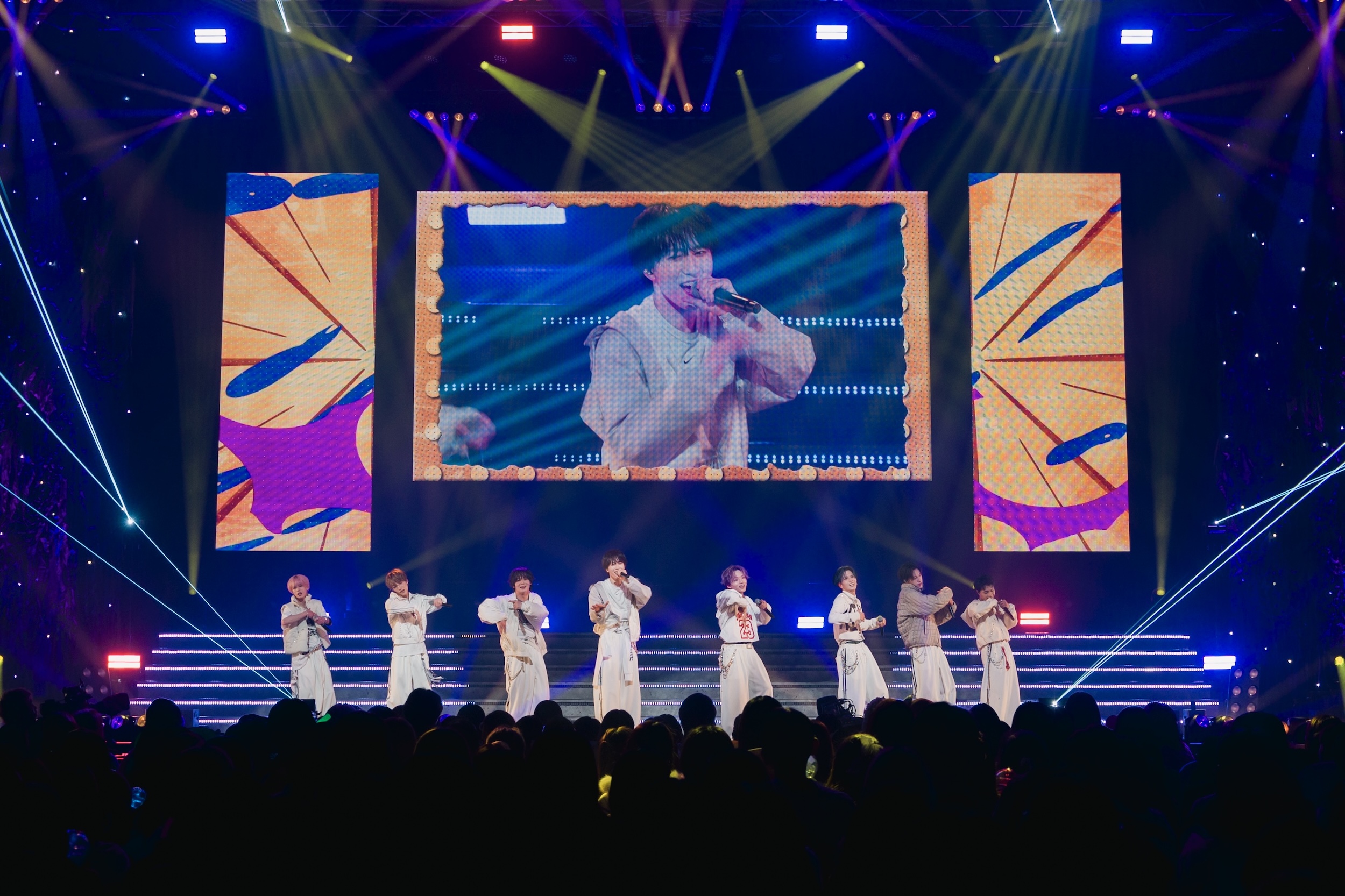 オリエンタルな『Carnival』では、メンバーがマントを羽織った状態で、アリーナ、2 階、3 階など客席にバラバラに登場し近い距離で楽 曲を浴びせるように歌いながらステージに戻ると、8 人が一列になりマントを翻しながら妖しく見せ、アウトロでは炎を浴びながら荒々しくダ ンスパフォーマンスを見せたあと、ドラマティックなイントロから始まる『prism』ではシリアスに、揃えたダンスで曲の世界を伝えていく。叫ぶよ うな⻄島蓮汰の歌声、囁くような太田の優しい歌声、そして破壊力のある強い芯を持つ高橋わたるの歌声など、それぞれの声の良さが 進化し、しっかりと伝わっていく。ライブごとにそれぞれが成⻑していく姿を感じられるのは、当たり前のようで当たり前ではないこと。そこには しっかりと努力が刻まれていた。