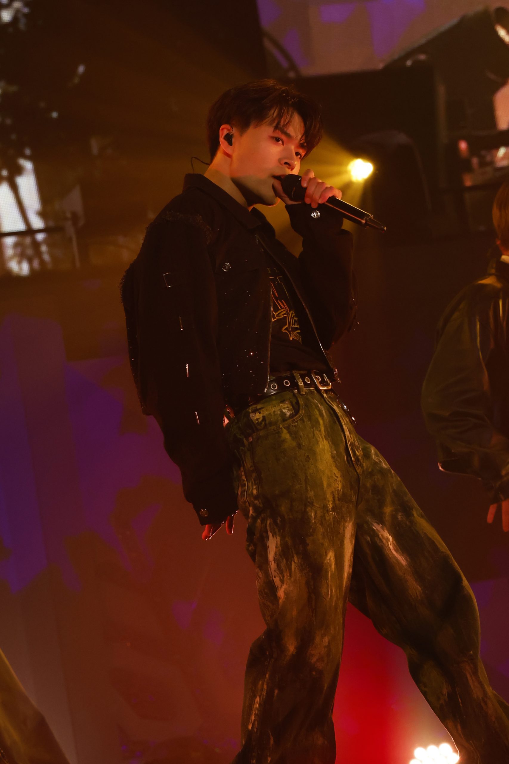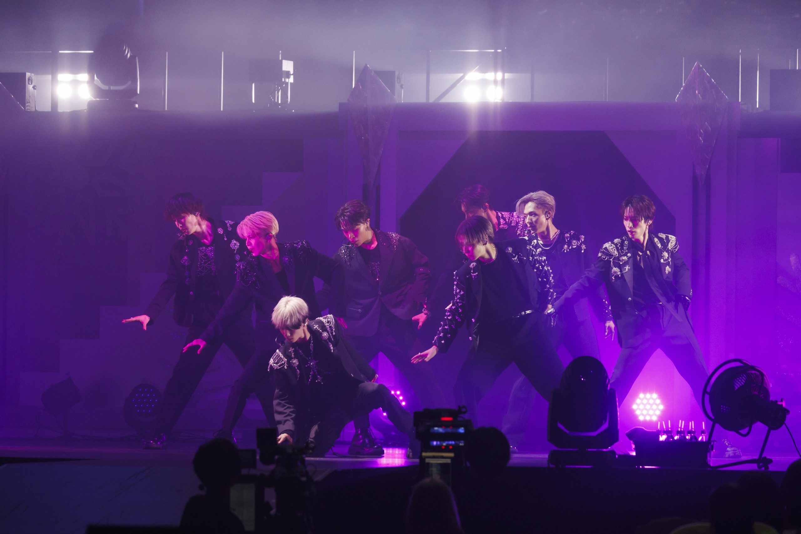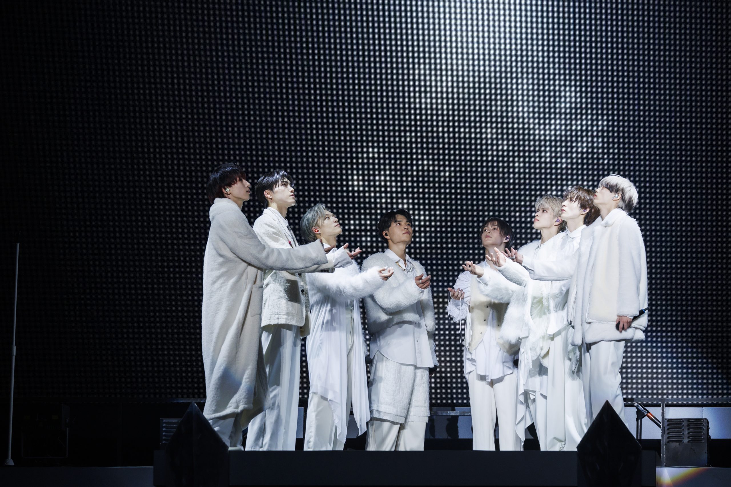 さらに彼らの単独ライブだからこそ魅せられる“SHOWCASE”も充実。四谷と太田のボーカルユニット曲では、四谷が作曲、太田が作詞をした疾走感あふれる楽曲を歌い上げ、栗田と小堀の“しゅーくりーむ”は頭にリボンをつけて=LOVEの「絶対アイドル辞めないで」を最大限のキュートで披露。ふたりが手を繋いでステージを去ると真っ赤な光を背負い古瀬が登場し、彼が憧れるダンサーのToshiyaとKAZUMA BOYとともに艶やかでテクニカルなダンスで空気を変え、花道をランウェイする美しい姿は圧倒的。さらに小堀と海帆、西島はマイクを持ち自ら手掛けたリリックに、これまでの感情を吐き出すようにラップに乗せていく。そして、自己紹介時に“光を操れるんです”と言ってペンライトの光を変えていた高橋は“狼”をテーマにゴージャスな衣装をまとい、その美しいビジュアルとセクシーなダンスを見せたあと、先ほどの言葉通り、光の玉を操り会場を煌びやかに色付かせていく演出はため息モノだった。