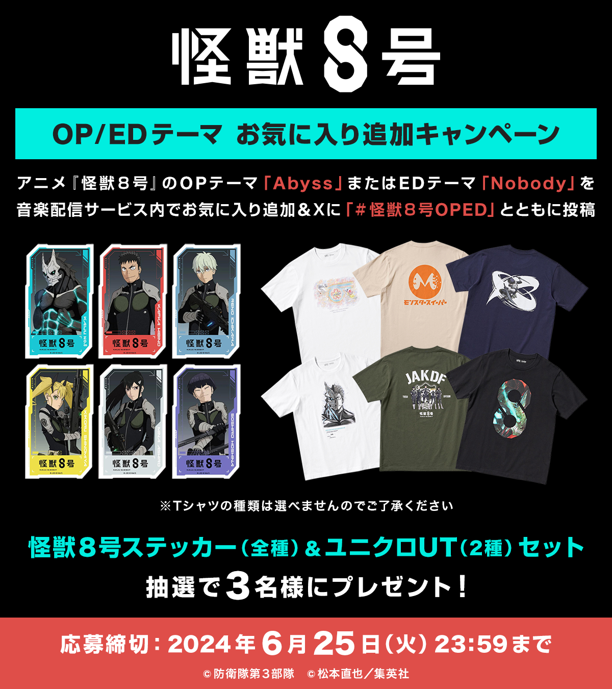 現在の放送中のアニメ『怪獣8号』のOPテーマ「Abyss」またはEDテーマ「Nobody」を音楽配信サービス内でお気に入り追加&Xに投稿した方の中から抽選でアニメ『怪獣8号』ステッカー & ユニクロUTをセットにして3名様にプレゼント!ぜひこの機会にご参加ください!