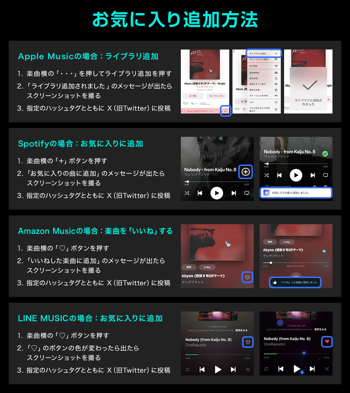 ①各音楽配信サービス(Apple Music/Spotify/Amazon Music/LINE MUSIC)で