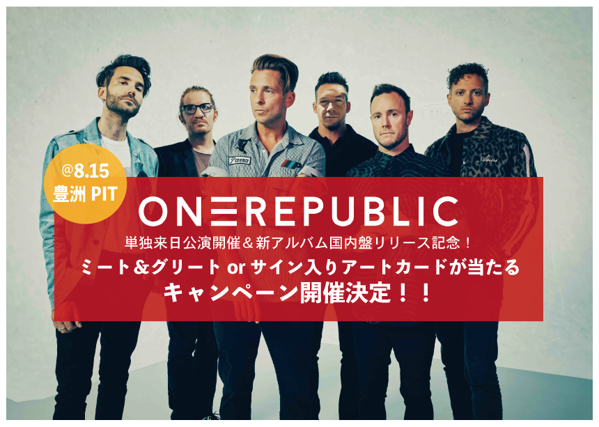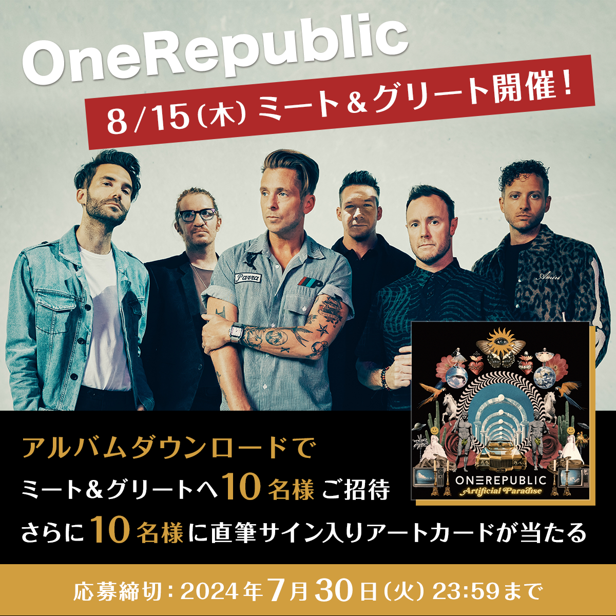 NEWS ALL TOPICS MEDIA LIVE/EVENT 2024.11.23 TOPICS カントリー界を席巻している元ラッパーのジェリー・ロールをフィーチャリングに迎えた「Hurt (feat. Jelly Roll)」をリリース、MVも公開 2024.08.26 TOPICS ワンリパブリック ライブラリ追加キャンペーン開催中 2024.08.08 TOPICS 8/15(木)豊洲PIT単独公演会場でニューアルバム購入者から抽選で100名様に、特典「直筆サイン入りアートカード」をプレゼント! 2024.08.05 TOPICS 8月5日は「8号の日」! アニメ『怪獣8号』EDテーマ「Nobody」再生キャンペーン開催 2024.07.31 TOPICS 最新AL『アーティフィシャル・パラダイス』国内盤CDが遂にリリース! バンドからコメントも到着&国内盤CD購入者にはミート&グリートが当たるチャンスも! 2024.07.12 TOPICS アーティストに会える「ミート&グリート」が当たる! ニューアルバム『アーティフィシャル・パラダイス』ダウンロードキャンペーン開催決定 2024.07.12 TOPICS ニュー・アルバム『アーティフィシャル・パラダイス』本日リリース! 2024.07.05 TOPICS ニュー・シングル「Hurt」配信開始! 2024.07.05 TOPICS ニューアルバムから新曲「Hurt」が公開!国内盤CD応募抽選キャンペーン詳細が発表! 2024.06.29 TOPICS アニメ『怪獣8号』OP/ED テーマ 楽曲再生キャンペーン 1234567…1312345…13