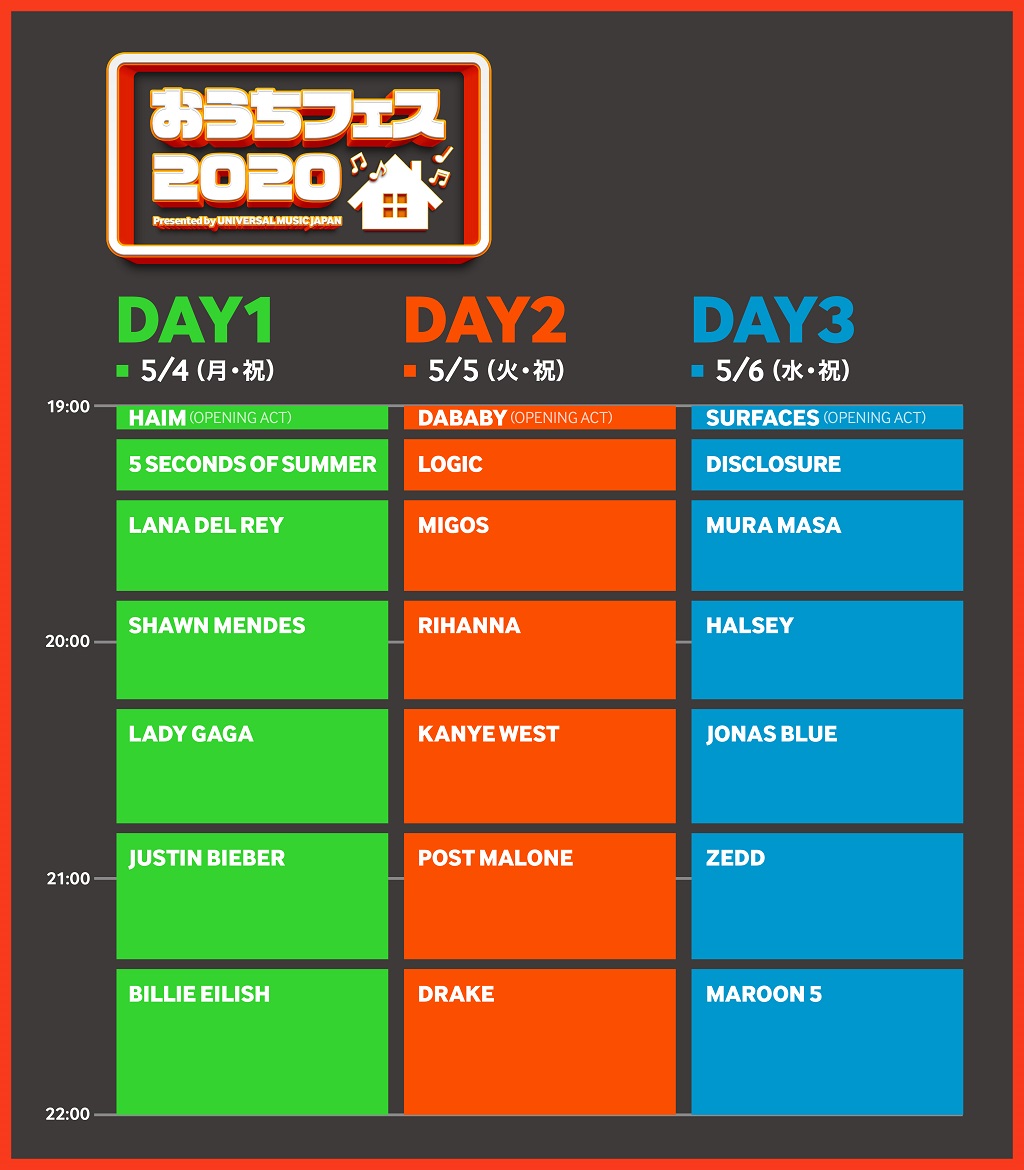「おうちフェス2020」と名付けられたこの企画は、ユニバーサル ミュージック洋楽に所属する人気アーティストのミュージック・ビデオを、本物のフェスさながらに3日間に渡りLINE LIVE上で放送するものです。