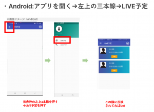 Android:アプリを開く→左上の三本線→LIVE予定