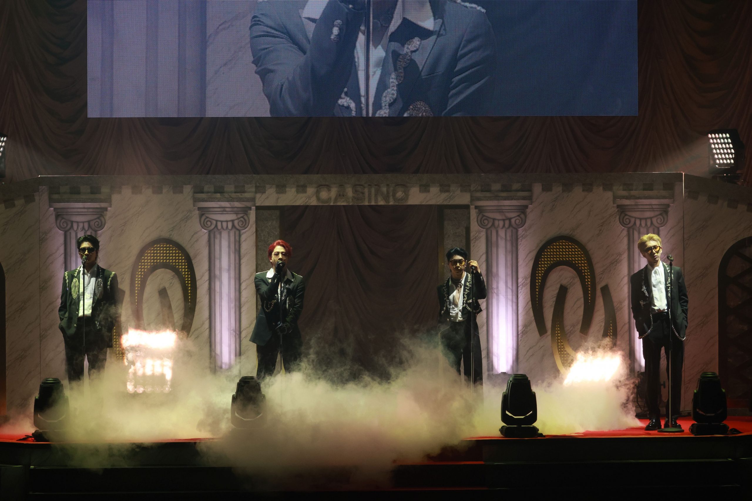 スタンドマイクの前に立った4人は、新曲『Gamer』を歌いだす。「CASINOに挑む者たち」という意味が込められた、本ツアーのテーマ曲だ。低音が響く重厚感があるナンバーだが、ダンスを封印し、なんと歌唱のみでのパフォーマンス。メンバーも歌いながら視線の先にいるQWVの姿をじっと見つめ、噛み締めているようだった。