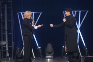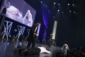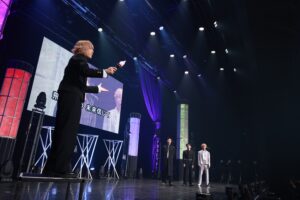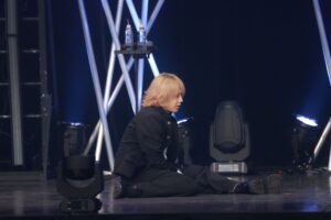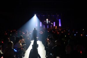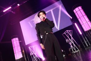 そしてこのイベントの大目玉でもある合唱がスタート。マイクスタンドの前に佐野、中川、浦野が立つなか、本田が指揮棒の代わりにペンライトを持ち、サッとふりあげると、何の打ち合わせもしていないのにザザッと音を立て肩幅に足を開くQWVと3人。義務教育で習った合唱への姿勢がしっかりと反映されている。いざ『旅立ちの日に』のイントロが始まると、QWVの表情はガラッと変わり、大きな口を開けて歌い出していく。その歌声はものすごく美しく、OWVの4人は笑いそうになるもしっかりと立て直し歌っていく。2年前はソプラノとアルトだけ、しかも女性が多いからこそソプラノが多く、終演後にSNSには、次の大阪公演のためにバランスをとるようにソプラノとアルト、どちらも練習すると意気込むQWVがいたのが印象的だったが、今回はソプラノ、アルト、男性パートといいバランスで音声が成り立ち、本当にキレイに仕上がっている。…と、ここまで熱く執筆していても、なぜこんなにみんなが合唱に打ち込むのかと疑問が浮かぶが、これが王舞学園なのだ。しかも、この1回目の合唱で本田の指揮があまりうまくいかなかったということで2回目の合唱が行われ、今度こそという想いなのか、初回を上回る合唱が行われ、曲の終わりには大きな拍手が上がり、みんなが今までにない達成感に包まれていた。