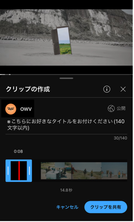 クリップする動画の範囲を選択します。スライダーをドラッグすると、選択範囲の時間を長くしたり(最長 60 秒)短くしたり(最短 5 秒)できます。
