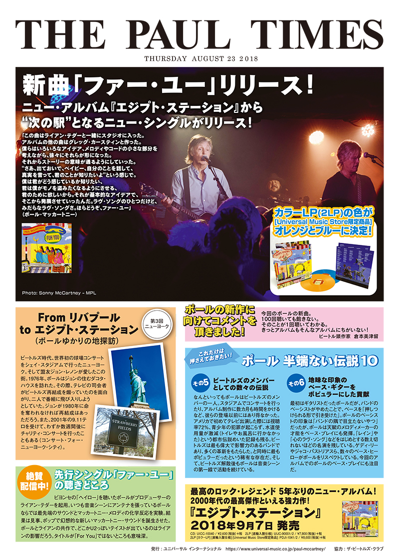 ポール・マッカートニーの最新情報、トリビア、新作の聴きどころ等を掲載した「The Paul Times」第3号! 2018.08.23 TOPICS 9月7日発売ポール・マッカートニーのニュー・アルバムに向けて、最新情報、トリビア、新作の聴きどころ、などを掲載した「The Paul Times」第3号が公開されました! 「The Paul Times」第3号はこちら 「The Paul Times」第2号はこちら 「The Paul Times」第1号はこちら