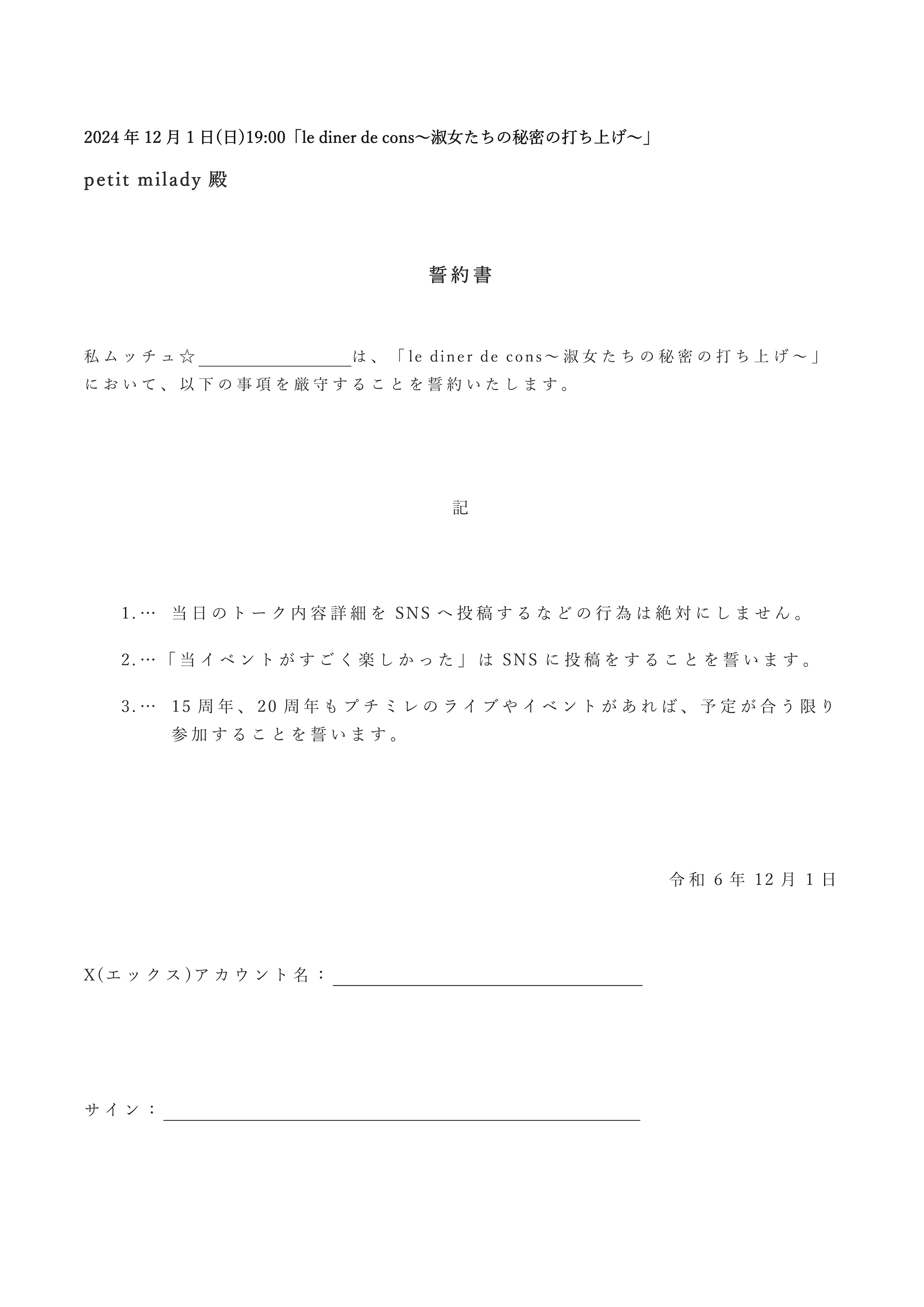 12/1(日)開催『le diner de cons~淑女たちの秘密の打ち上げ~』誓約書ダウンロード 2024.11.28 LIVE 『le diner de cons~淑女たちの秘密の打ち上げ~』にて以下の誓約書が必要となりますのでダウンロードお願い致します。