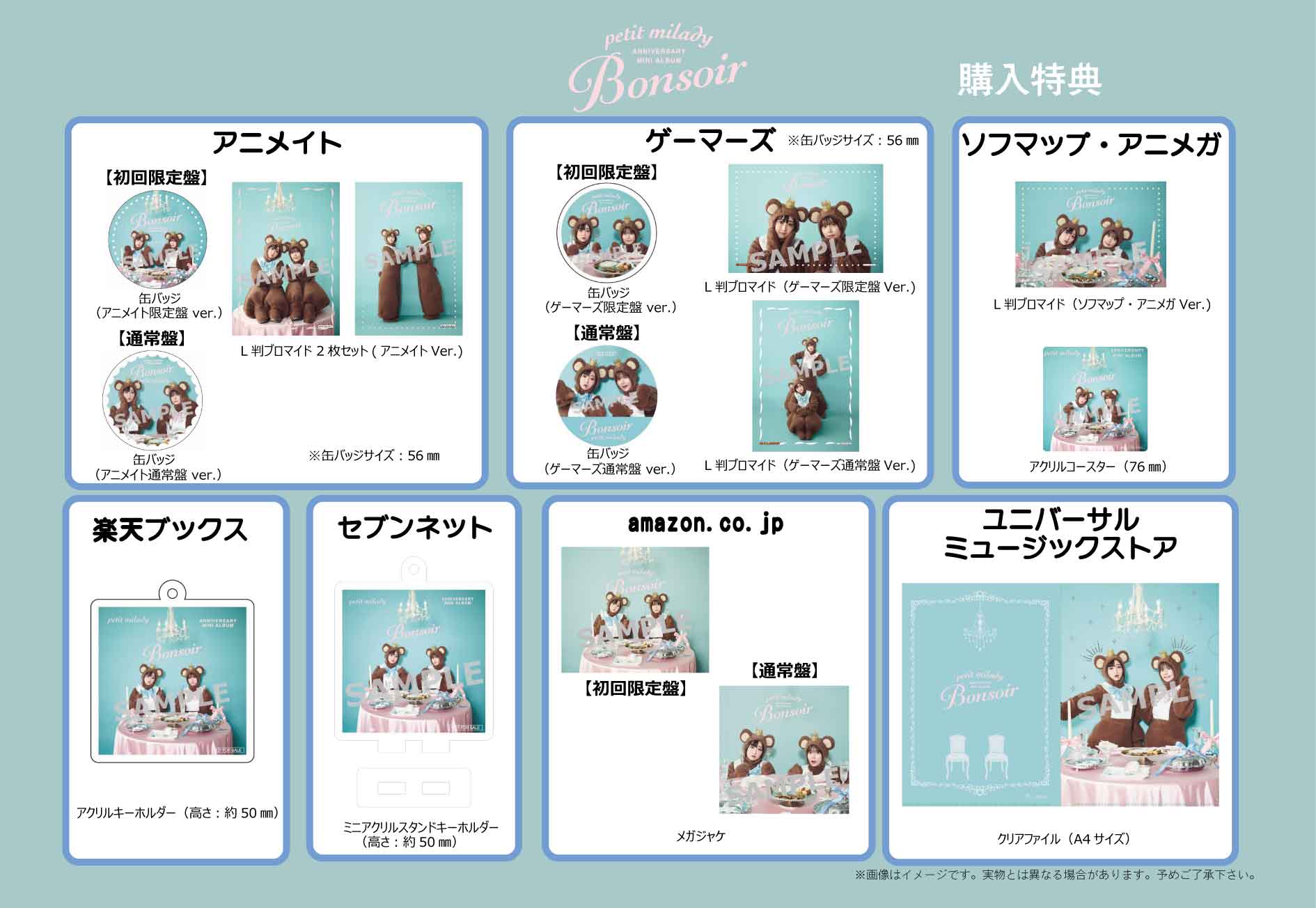 『petit milady ANNIVERSARY MINI ALBUM~Bonsoir~』 特典見本画像の訂正とお詫び 2024.11.27 TOPICS 先日ご案内致しました購入特典見本画像の中で、一部誤りがございました。つきましては、下記の通り訂正させていただきます。ご迷惑をおかけしましたことを、深くお詫び申し上げます。 ――――――――――――――――――――――――― 【ゲーマーズ購入特典 ブロマイド】 【購入特典一覧】 ―――――――――――――――――――――――――※ゲーマーズのHP、店頭等では、正しい画像が掲載されております。