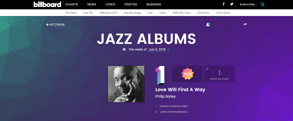 フィリップ・ベイリーのソロ・アルバム『ラヴ・ウィル・ファインド・アウェイ』が2019年7月6日付、米ビルボード・チャート「カレントジャズ」 と「コンテンポラリー・ジャズ」にて1位を獲得!また「R&B」でも12位にチャートインしました!