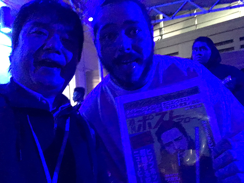 迎えた6月27日、超多忙なポストを抱えるだけにライブ直前までマネージメントからなかなか確約が出ませんでしたが、無事に出演前にバックステージ・エリアに開設されているバーエリアでポストに対面!実際に話したポストは、あのコワモテからは想像できないほど、かなりフレンドリーで礼儀正しい好青年という印象。身長は約190cmという大男なのに笑うと途端にカワイくなるポストは想像通りのアニメ好きでした。お土産に、ユニクロで販売中の少年ジャンプ・コラボTシャツ・シリーズのいくつかをプレゼントすると、いきなり“KAKASHI!”と叫んでました(笑)。場所がパーティー会場的なノリでかなりの人がごったがえしていた為、ゆっくりと落ち着いては話せませんでしたが、自分の好きなアニメやゲームのルーツでもある来日は本当に楽しみにしてるようでした。