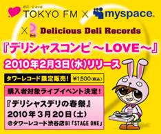 ユニバーサル ミュージック合同会社 (東京都港区、CEO兼社長 小池一彦 / 以下、ユニバーサル ミュージック) では、同社洋楽レーベル内に2009年に設立した邦楽レーベル 「デリシャス・デリ・レコーズ (Delicious Deli Records)」 と、世界最大級のエンタテインメント系ソーシャル・ネットワーキング・サービス 「MySpace」 を運営するマイスペース株式会社 (東京都渋谷区、代表取締役社長 大蘿 淳司 以下マイスペース)と、TOKYO FMの3社合同で昨年秋に実施した “楽曲オーディション” に合格したアーティストの楽曲を収録したコンピレーション・アルバム 『デリシャスコンピ~LOVE~』 を 2月 3日 (水) に発売します。