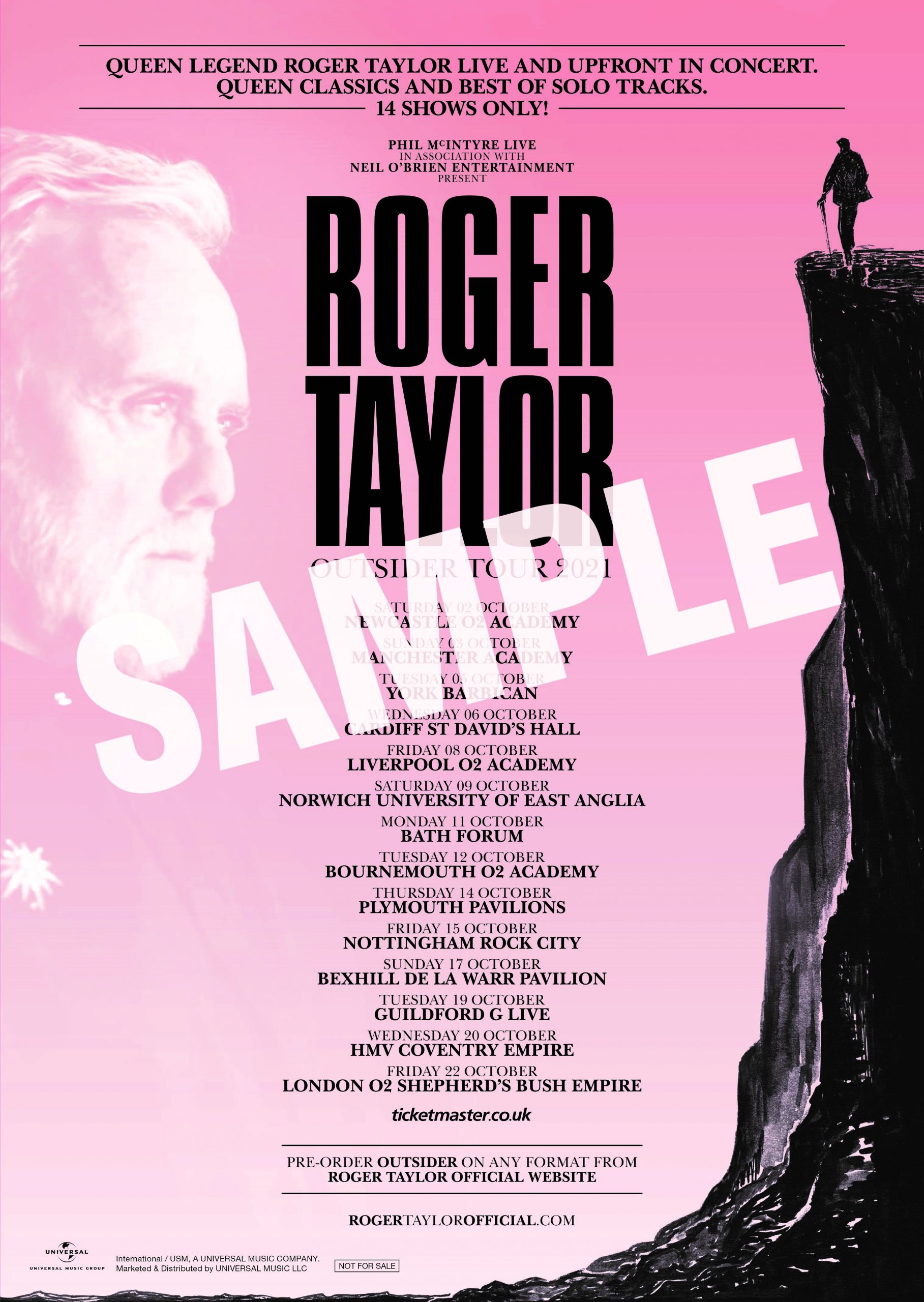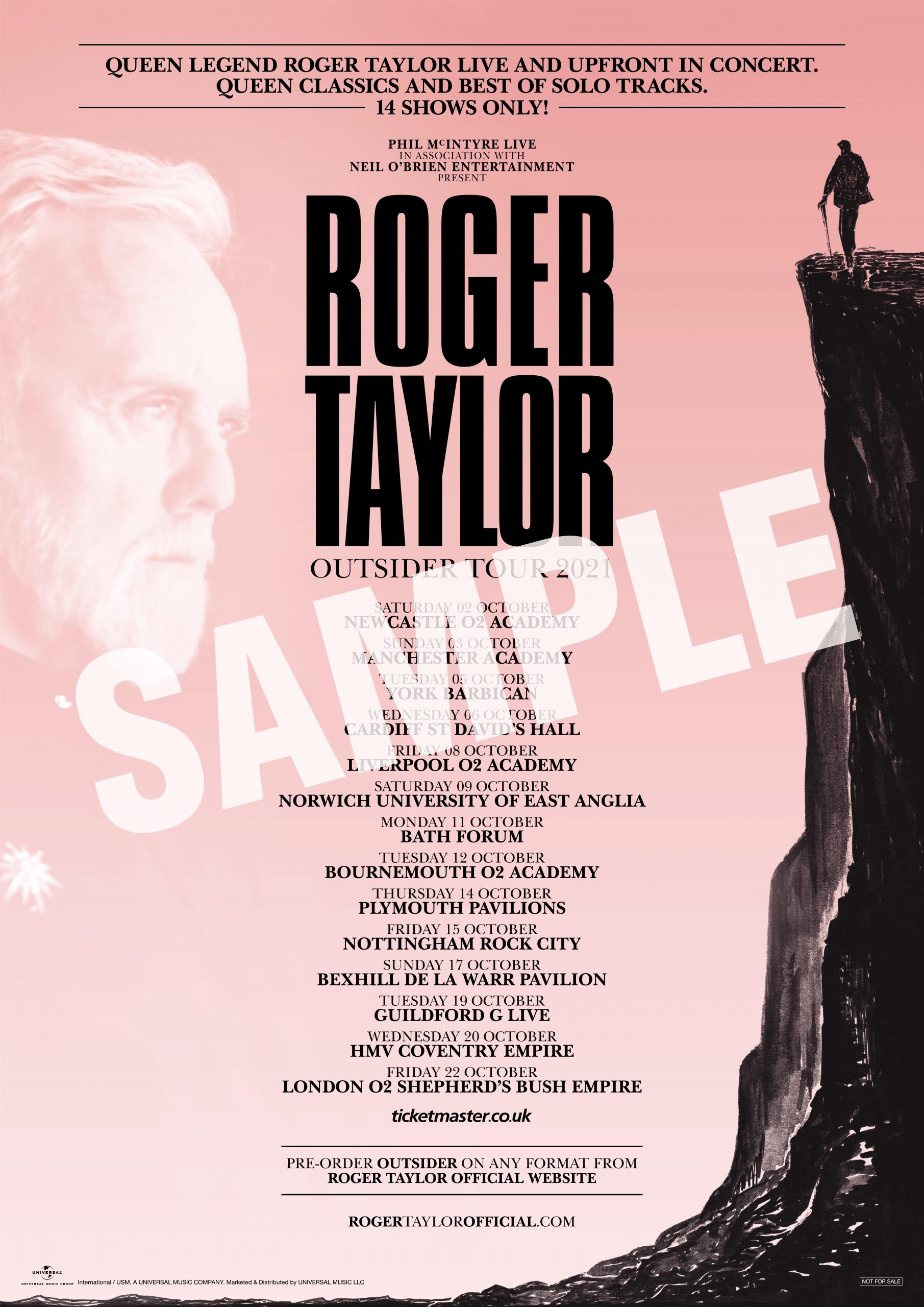 アルバム『アウトサイダー』のリリースに合わせ、ロジャー・テイラーは、クイーン以外では20年以上ぶりとなるライヴを実施。クイーン+アダム・ランバートのキーボード奏者スパイク・エドニー、サポート・ドラマーのタイラー・ウォーレン、ベーシストのチャーリー・ジョーンズ他から成る、このツアーのために特別に組んだバンドを率いて、10月に英国で14公演を行う予定だ。