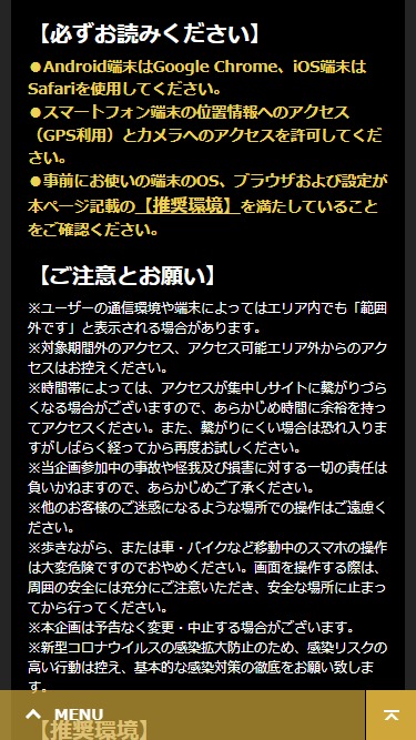 • ※GPSによる位置情報を取得するため、スマートフォンの電池を多く消耗します。スマートフォンの充電、予備バッテリーの携帯など、電池に余裕を持った状態でアクセスしてください。