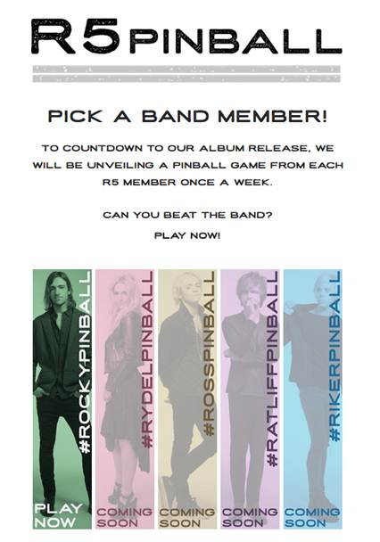 R5ピンボール 2015.06.04 TOPICS R5のピンボール・ゲームが公開されました。英語になっていますが、簡単です。メンバーを選んで、PLAYをタップするだけ。(今週は、ロッキーです)是非、ツイッターで情報共有してみてください! http://smarturl.it/R5Pinball