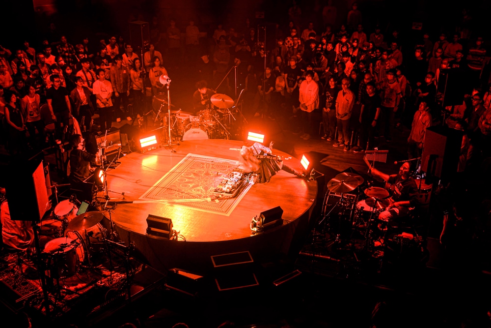 中央の円形ステージの3方にドラムセットを配し、センターにReiが立つ。そしてステージ周囲の360度が客席で囲まれており、場内のエネルギーがすべてReiに注ぎ込まれているような雰囲気だった。Reiもそれに応えるかのように、ひたすら熱いパフォーマンスを繰り広げた。各ドラマーとの緩急自在なデュオも素晴らしかったが、何と言ってもトリプル・ドラムとのダイナミックな共演が圧巻で、個性豊かな3人のドラマーと生み出されるケミストリーが大きなうねりを生み出し、会場内を包みこんでいた。