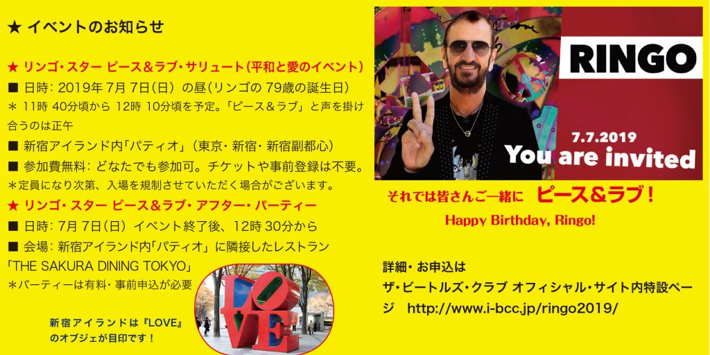 リンゴが自身の誕生日、7月7日に全世界に開催を呼びかけているイベント『リンゴ・スター ピース&ラブ・サリュート(平和と愛のイベント)』を、7月7日(日)の正午に新宿副都心にある新宿アイランドの公共スペース『パティオ』で開催することになった。