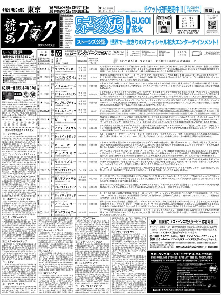 パンフレットに記載されている、【出曲表18曲】から、ストーンズ花火打ち上げ時のセットリストの1曲目と2曲目を曲順通りに予想(※競馬で言う馬単)し、Twitterにて #ストーンズ花火ダービー をつけて応募。