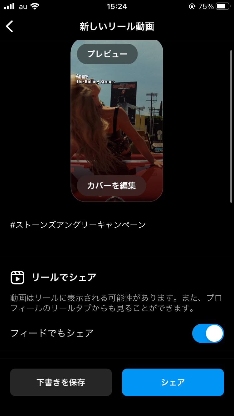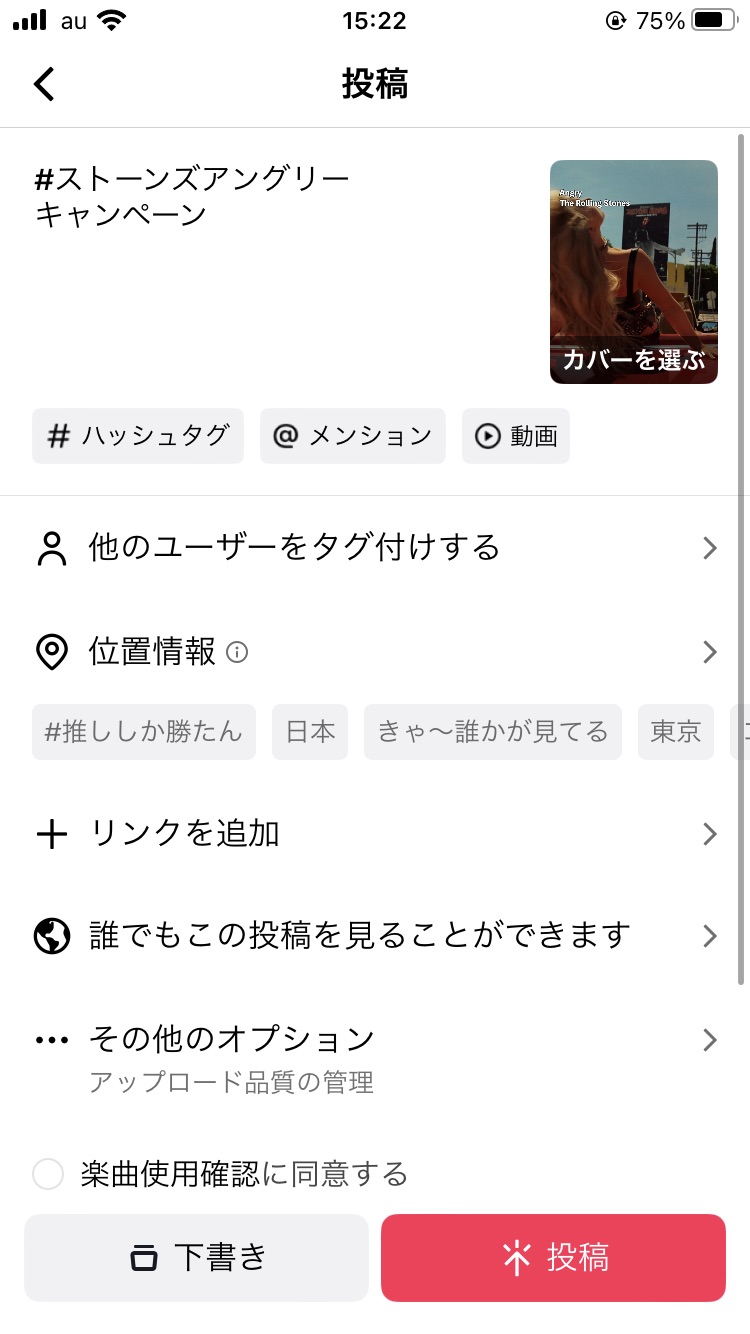 ③「次へ」をタップしたあと、動画の説明文に「#ストーンズアングリーキャンペーン」をいれて投稿