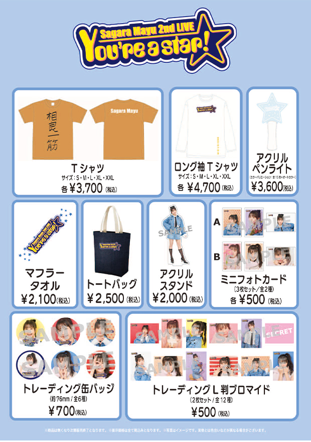 (アクリルペンライト、Tシャツ、ロング袖Tシャツ、マフラータオル、トートバッグ、ミニフォトカードセットA・B、アクリルスタンド)