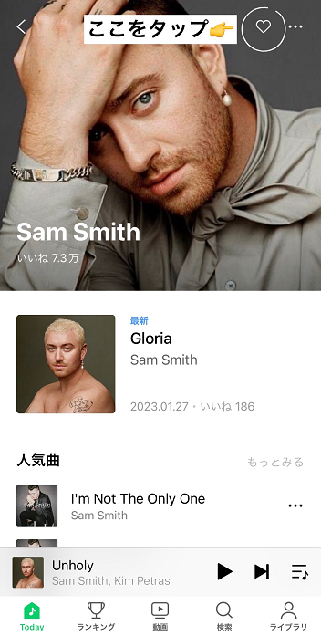 ①LINE MUSICでサム・スミスをフォロー(プッシュ通知はオンにしてください)