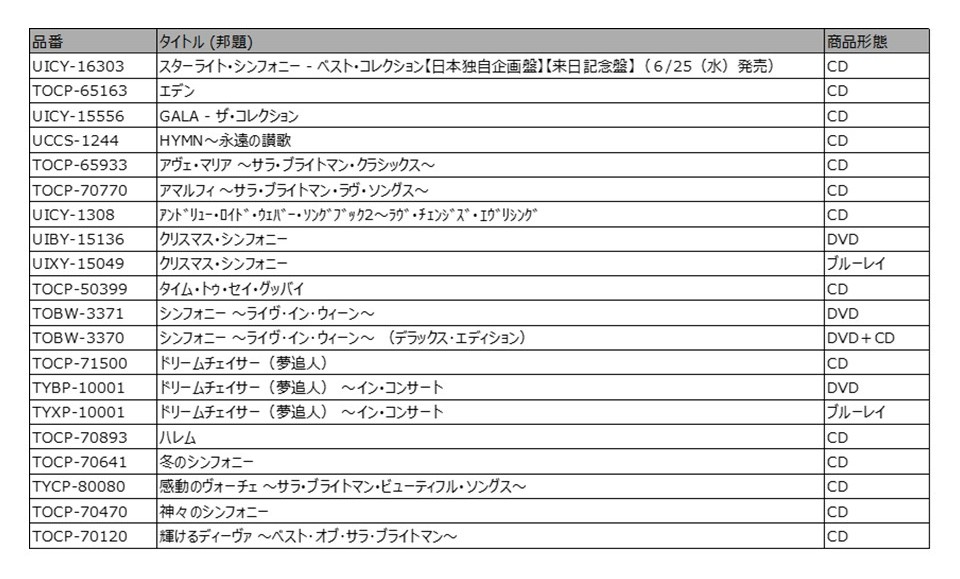 そのジャパン・ツアーを記念してタワーレコード各店にてサラ・ブライトマンの来日記念キャンペーンの開催が決定いたしました!