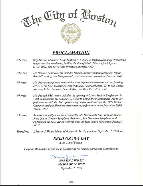 ボストン市長が2020年9月1日をSeiji Ozawa Day(小澤征爾の日)に制定