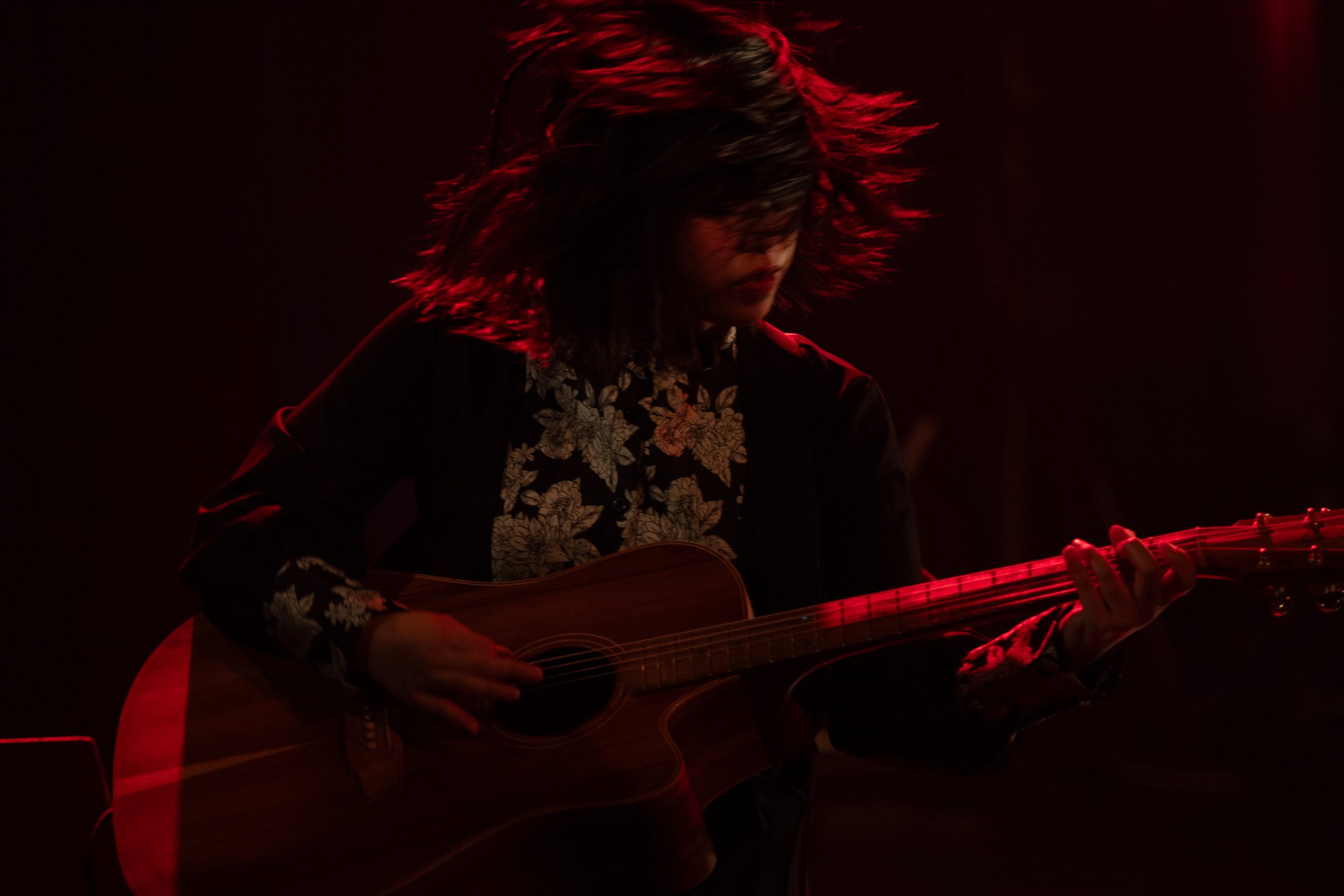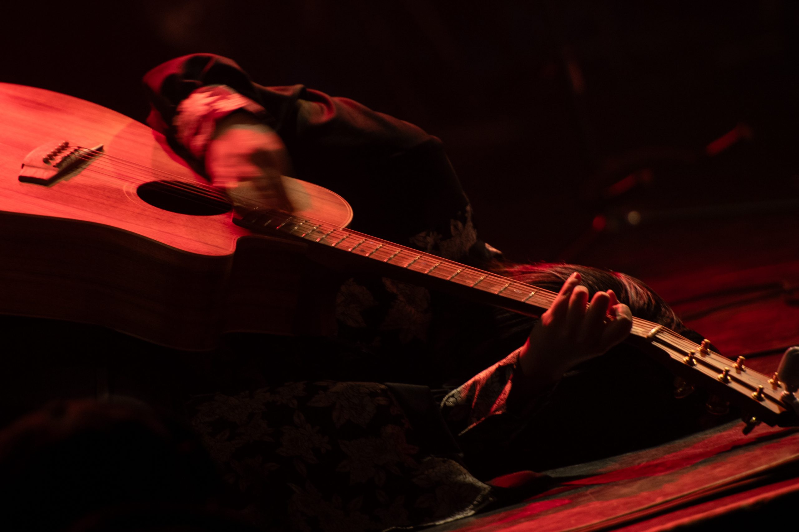 そして最後は「リゼントメント」。手のひらで弦をミュートしながら弱めのストロークでしっとりと始まったかと思いきや、一転して全身の力を込め叩きつけるようにアコギをかきむしる。〈冷たい身体の中に燃えるような怒り〉〈君が悪魔なら僕は天使だ/君が天使なら僕は悪魔だ〉と、自らの内側にあるアンビバレントな感情を吐き出すように歌い、感極まった彼女はステージに跪きながらなおも演奏を続ける。そして力尽きたようにそのままステージに倒れ込むと、フロアからは大歓声が巻き起こった。