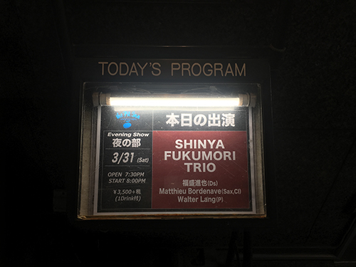 定刻から5分遅れてShinya Fukumori Trioがステージに登場すると、沈黙のなかに滑らかな福盛のシンバルが響き、「サイレント・カオス」、「星めぐりの歌」が続いて演奏された。アルバムのテイクと同様に叙情的でありつつも、ライブならではのインタープレイが楽しめるパフォーマンスが繰り広げられる。滝 廉太郎作曲の「荒城の月」が組み込まれた大曲「ザ・ライト・スイート」の演奏後に「映画を観てるようにリラックスしながら聴いてください」と福盛が語ったように、ファースト・セットは計6曲がひとつのストーリーであるかのように演奏され、リズム・キープという一般的なドラマーの役割を担うのではなく、楽曲の世界観を演出することに重きを置いた福盛のドラミングが際立つステージであった。