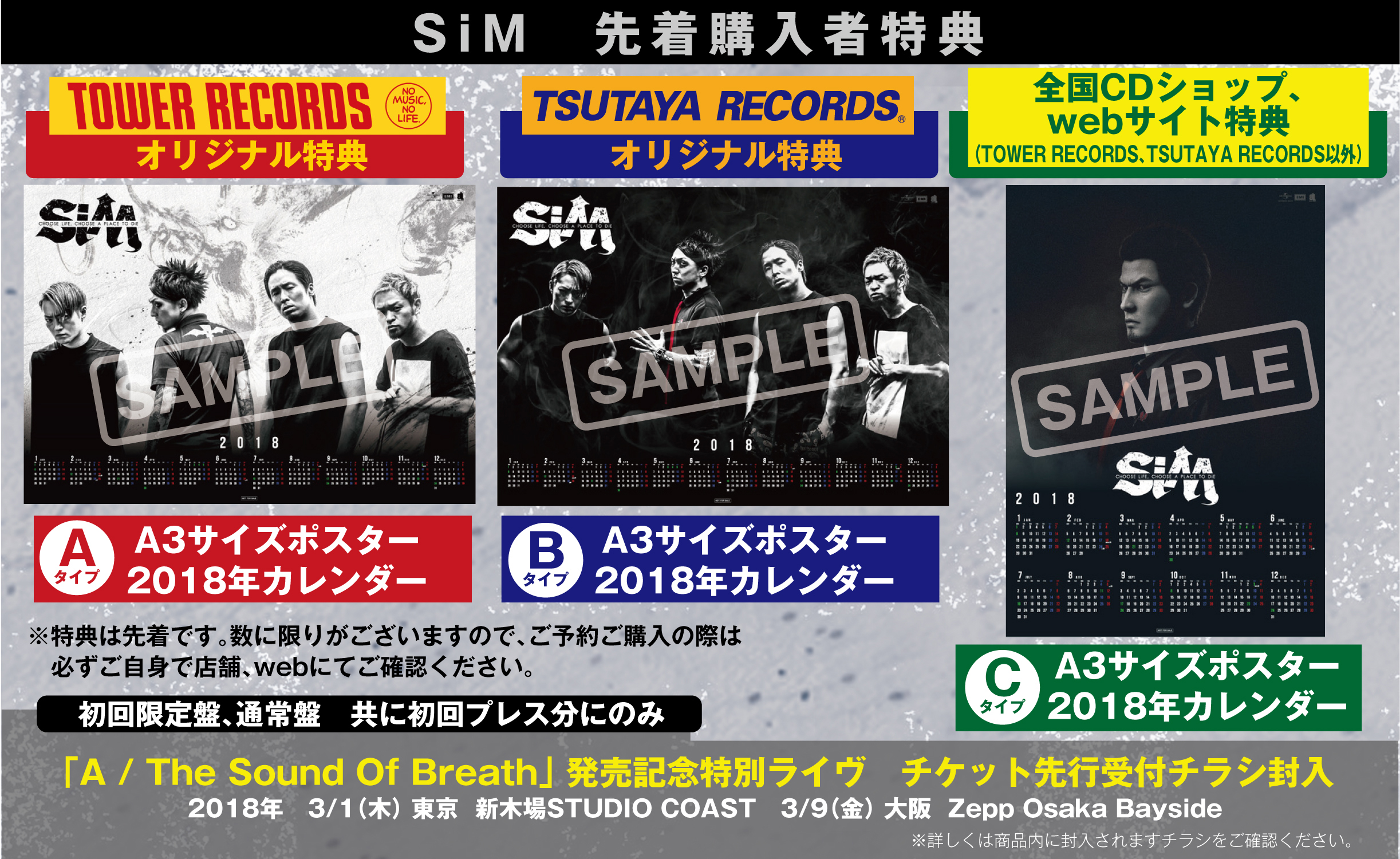 さらに、先着購入者特典として、TOWER RECORDS、TSUTAYA RECORDS、その他の全国CDショップ/WEBサイトにて、3種のポスターカレンダーが当たることも発表されました。