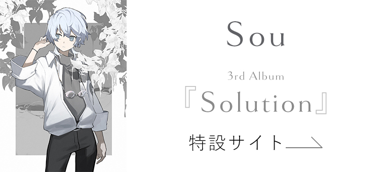 WHAT'S NEW 2022.06.27 TOPICS Sou NEW ALBUM「Solution」 ブックレット歌詞表記 誤植に関するお詫び 2022.06.16 TOPICS Sou Digital Single「常夜灯」配信記念LINE MUSIC 再生キャンペーン実施決定! 2022.06.14 TOPICS ニューアルバム「Solution」アルバム収録曲提供作家発表! 2022.06.07 LIVE ニューアルバム『Solution』 購入者抽選特典「オンラインサイン会」実施決定!! 2022.06.07 TOPICS ニューアルバム『Solution』購入者抽選特典「オンラインサイン会」に関しまして当選者の方の「お名前」の記入が決定致しました! MORE