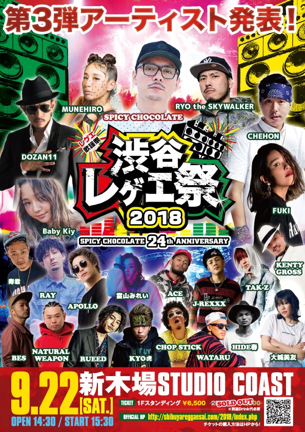 SPICY CHOCOLATEが主催するフェス「渋谷レゲエ祭~レゲエ歌謡祭2018~」の第3弾出演アーティストも本日発表となった。今回発表となったのは、RYO the SKYWALKER、MUNEHIRO、CHEHON、DOZAN11といった渋谷レゲエ祭常連組に加え、7月24日配信の『シリタイ feat. C&K & CYBERJAPAN DANCERS』に収録される「あの夏の feat. TAK-Z & Baby Kiy」にも参加しているBaby Kiyが初出演。更に3年連続の出演となるFUKIもラインナップされた。