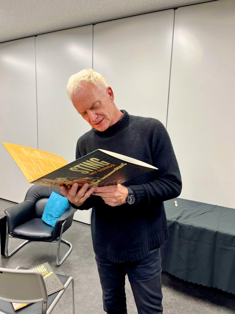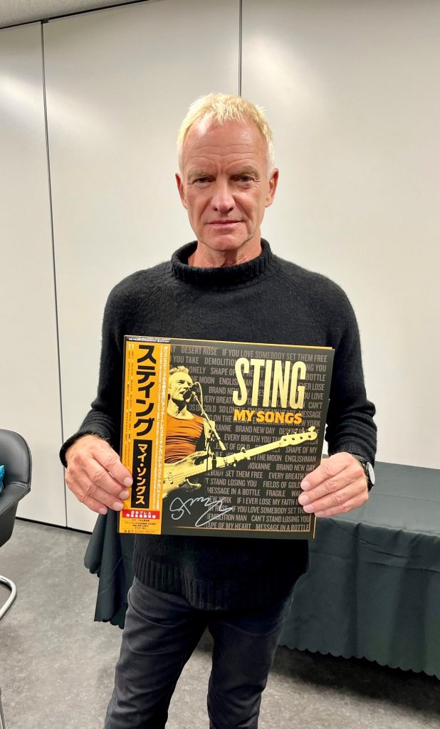 この写真には、今回の来日公演を記念して制作され、3月8日に発売となった『マイ・ソングス』日本国内プレスのアナログ・レコードを持ったスティングの様子が映されている。こちらは完全限定生産となるので、購入はお早めに。