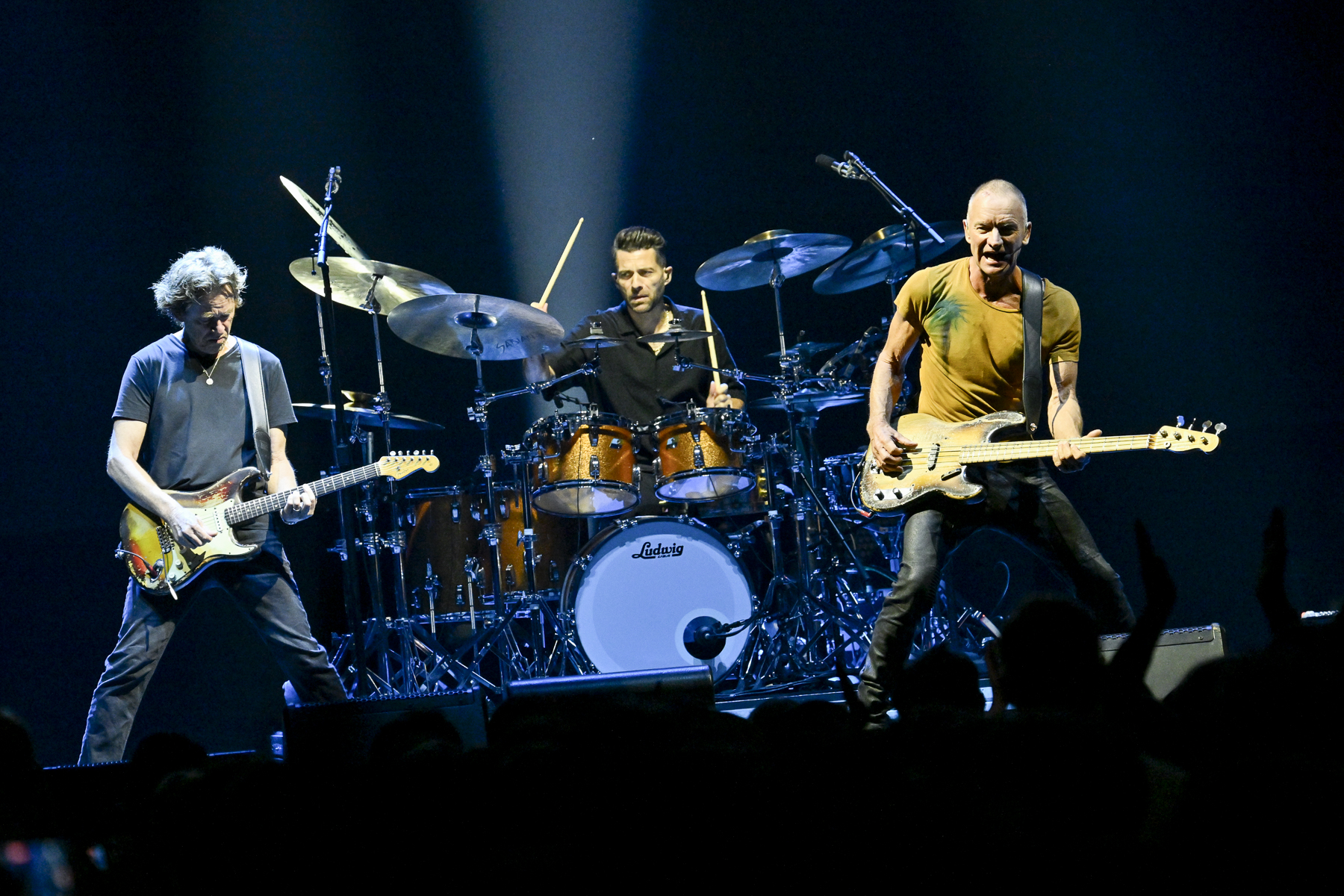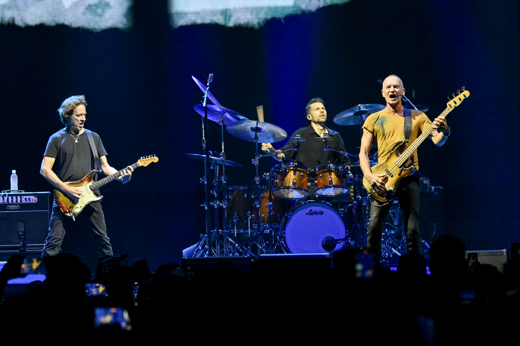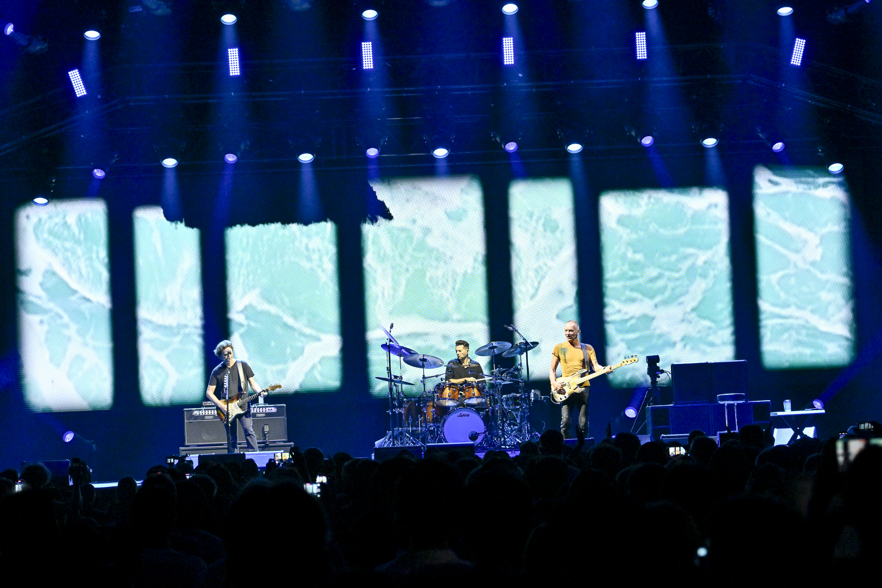 開演時間ほぼちょうどに客電が落ちると、シャープな照明が飛び交うなか、ドミニク・ミラーのギターが響き渡り、そこに、クリス・マースのドラムスが斬り込むように重なる。そしてスティングのベースが加わり、東京初日の1曲目がスタートした。「孤独のメッセージ」だ。最小限の楽器編成によるまったく無駄のないパフォーマンスながら、客席に伝わってくる音圧には凄まじいものがある。どの音も、じつに芯が太い。そう表現したらいいだろうか。