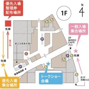 18:30より整理番号順に整列、順次入場を開始しますので、優先観覧エリア入場集合場所(*地図中「黄色」の印)にお越しください。