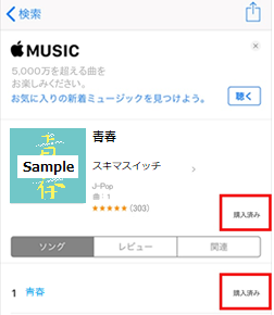 iTunes:以下赤枠内が「購入済み」となっているスクリーンショット