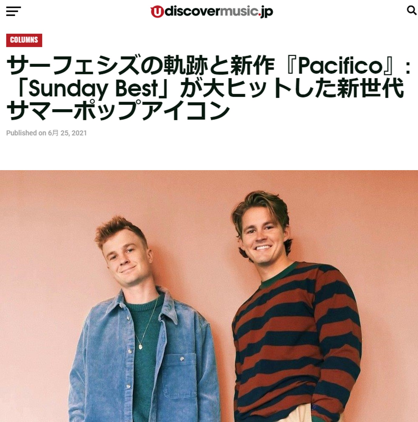 NEWS ALL TOPICS MEDIA LIVE/EVENT 2021.07.27 MEDIA - WEB フロントロウにて、インタビュー記事公開! 2021.07.16 MEDIA - WEB Spincoasterにてインタビュー記事が掲載 2021.07.13 MEDIA - TV 7/19(月)tvk「洋楽天国+」にてサーフェシズ特集がオンエア! 2021.06.28 MEDIA - WEB 【解説】サーフェシズの軌跡と新作アルバム『Pacifico』 2020.12.01 MEDIA - TV 1月12日(火)Eテレ「ヒャダ×体育のワンルーム☆ミュージック」にVTR出演! 2020.11.26 MEDIA - TV 12/2(水)深夜テレビ朝日系全国放送「BREAK OUT」にてサーフェシズのインタビューがオンエア! 2020.11.16 MEDIA - TV 11/16(月)tvk「洋楽天国+」にてサーフェシズ特集がオンエア! 2020.11.16 MEDIA - WEB WEB版「Rolling Stone Japan」でデビュー・アルバム『サンデイ・ベスト』のレビュー記事が公開! 2020.10.30 MEDIA - TV MTV 11月前期(11/1~11/15)BUZZ CLIPに決定! 2020.10.27 MEDIA - WEB WEB「マイナビティーンズ」で最新インタビュー記事が公開! 1212
