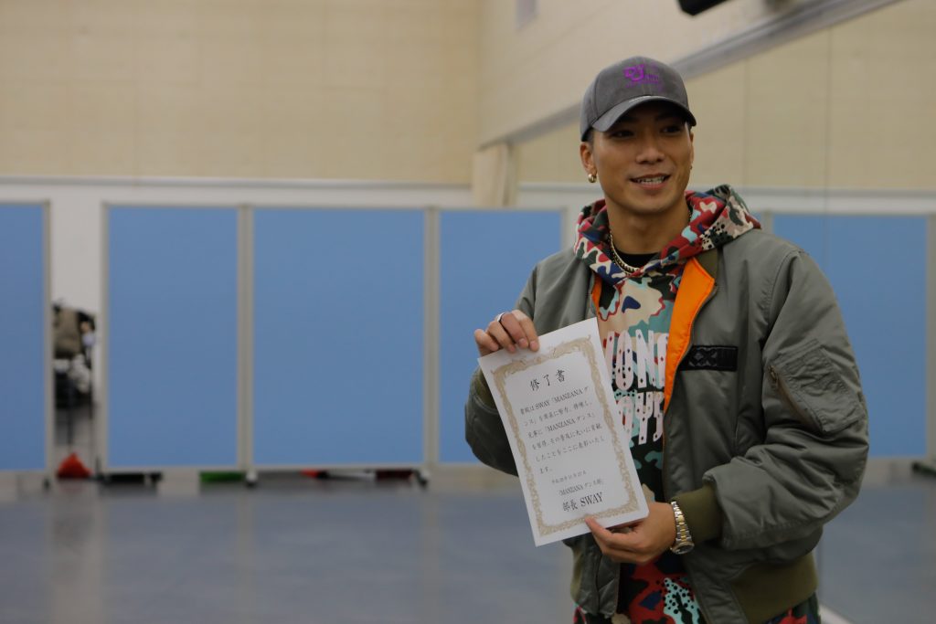 集まった100名の「MANZANAダンス部員」が待つなか、渋滞と道に迷い、定刻から5分ほど遅刻して「SWAY部長」が登場。「みなさんがSNSなど「MANZANAダンス」をアップ、拡散し始めたことがきっかけで「MANZANAダンス部」を結成する決意をして、ここにたった1日だけの部活動が実現することができました、ありがとうございます!そして、部長初日ですが、厳しく、指導していきますのでよろしくお願いいたします!」と冒頭で挨拶。懐かしい「ラジオ体操第一」で体を温め、部活がスタート。非常にわかりやすく、時にジョークをまじえながらのスパルタで厳しい指導を行い、「MANZANAダンス」の練習は進んだ。「りんごをもぎ取るポーズ」、そして実は「おにゃんこ倶楽部 / セーラー服を脱がせないで」の振りから取ったなどダンス誕生のエピソードも告白しながらの指導が続く。そして、その成果を全員での仕上げの本番の「MANZANAダンス」を踊ると、なんとSWAY部長自身が失敗するなどのハプニングもあるも、最終は全員で完璧なフォーメーションで「MANZANAダンス」を踊り、最後に「SWAY部長」から部員に「修了書」が手渡され、終始楽しい雰囲気のなか部活は終了した。