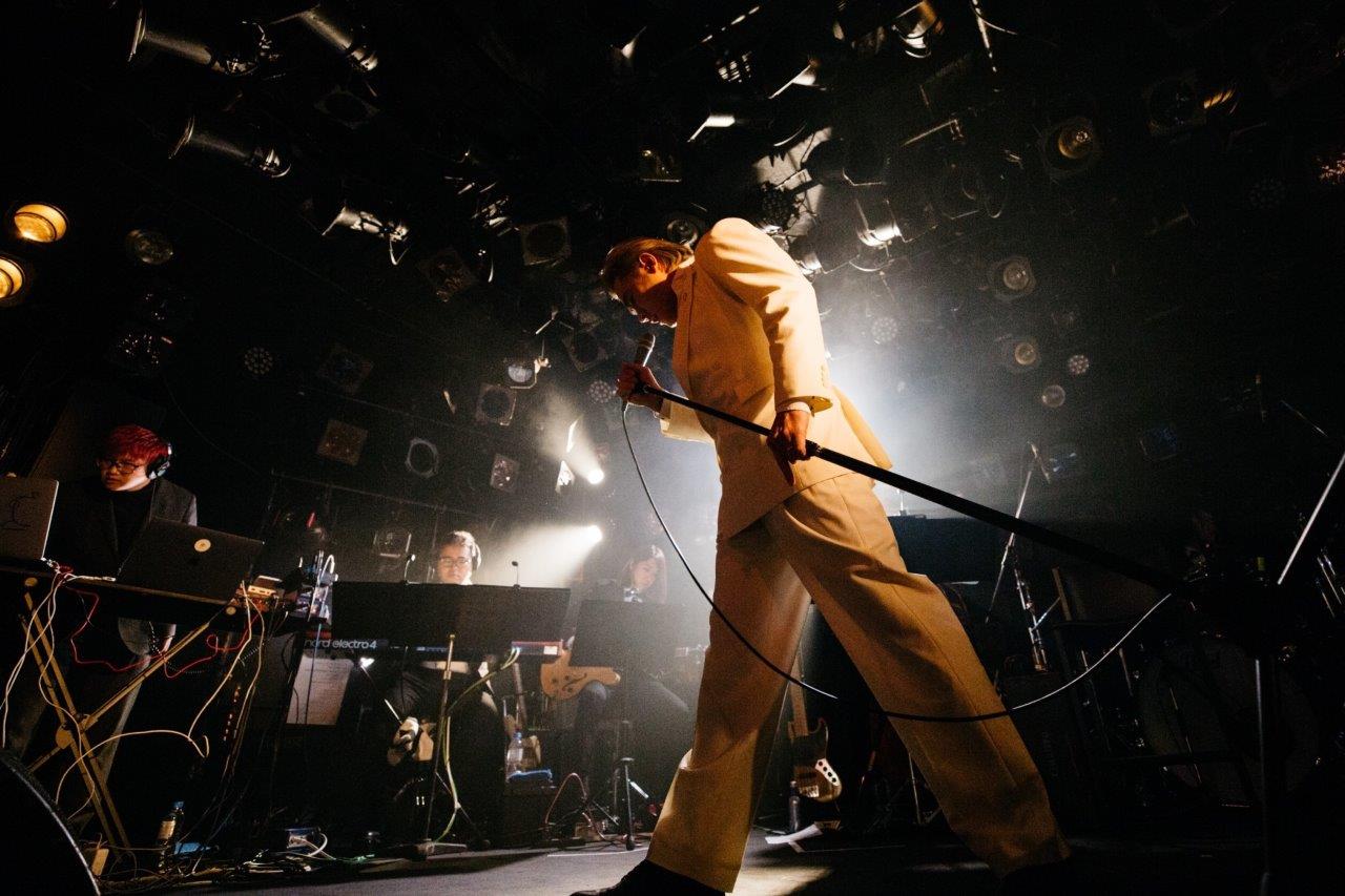 そして「あと二曲でライブは終わっちゃうんだけど、俺は必ずてっぺん取るんで、よろしく」と言葉が発せられスタートしたのは、アルバム『10』のリード・ソング「ROMANTIC」。高岩曰く“銀河系ラヴソング”である同曲は、軽快なハウス・ビートと豪華なビッグバンド・サウンドが見事に融合し、その上で一聴するとクサいと思われてしまうくらいに真っ直ぐな愛が歌われるキラー・チューン。会場は、この日最高の盛り上がりをみせ、ダンス・フロア状態に。「ROMANTIC」の興奮冷めやらぬなか、Yaffleが奏でるシンセサイザーの上で再度観客に感謝を述べて演奏されたラスト・ナンバー「TROUBLE」では、躍動感のあるビートと壮大なビッグバンドのサウンドの上で高岩が高らかに歌い上げ、ライブ本編が終了。