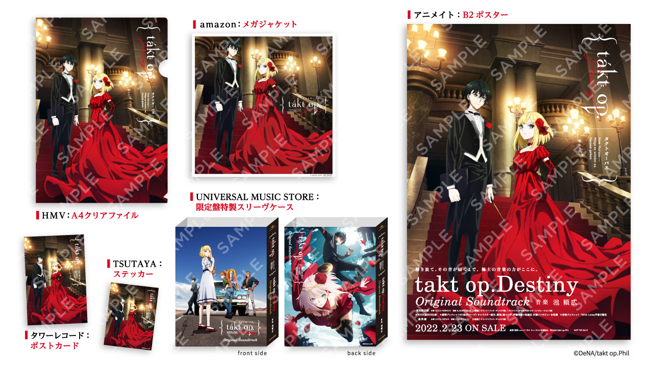 『takt op.Destiny オリジナル・サウンドトラック』特典デザイン公開! 2022.01.27 TOPICS 『takt op.Destiny オリジナル・サウンドトラック』のストア別特典のデザインが公開になりました! <ストア別先着特典> • タワーレコード:ポストカード • HMV:A4クリアファイル • アニメイト:B2ポスター • TSUTAYA:ステッカー • Amazon:メガジャケ • UNIVERSAL MUSIC STORE:限定盤特製スリーヴケース ※特典は数に限りがございます。 ※特典の取扱がない店舗もございますので、ご予約・ご購入の際にご確認ください。