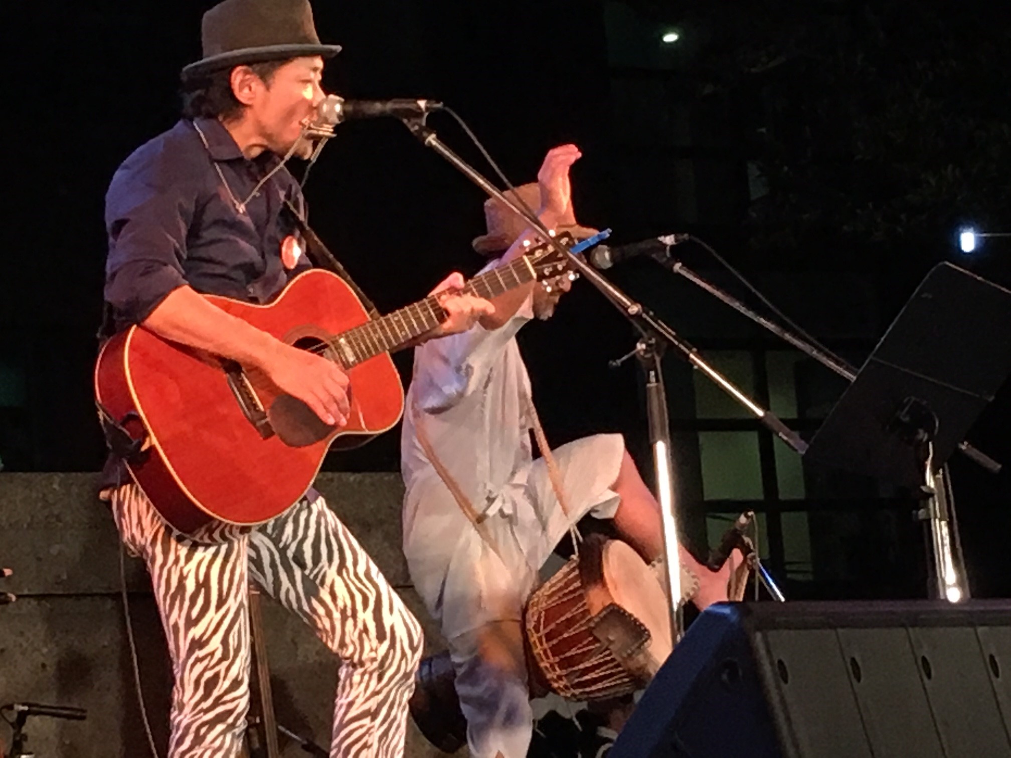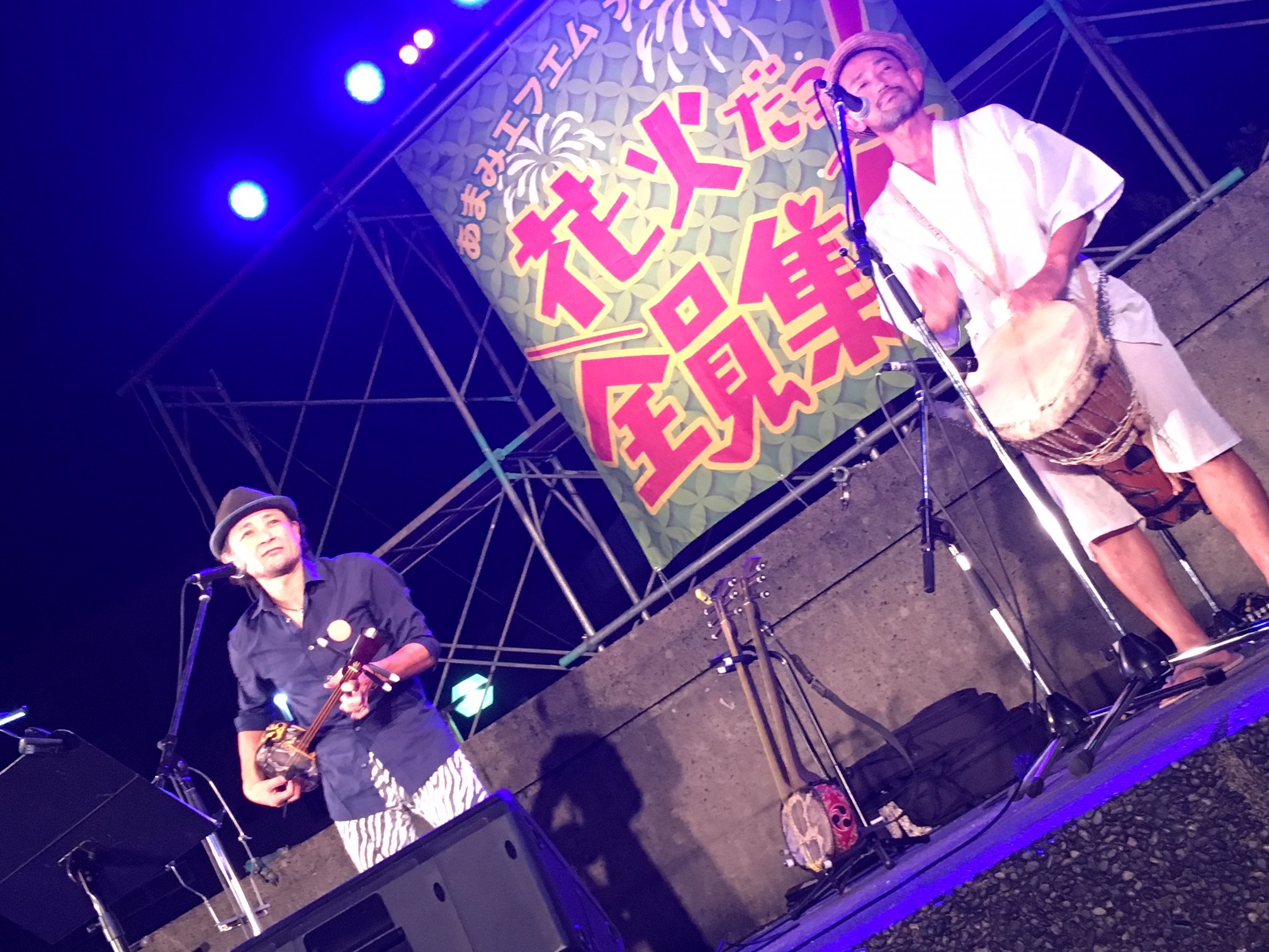 花火打ち上げの直後、広場に特設されたステージ前には約2千人の観客。奄美出身のアーティスト我那覇美奈がまずはパフォーマンスした。そしてイベントの大トリとして、奄美で1本だけのダブルネック三味線を抱えた奄美3世のタナカアツシとパーカッショニスト奈良大介で構成される島唄ユニット「マブリ」がステージに登場。「マブリ」とは奄美の方言で「魂」を意味する。