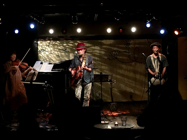続いてデビューシングルから「てぃだぬうた 花ぬうた」を披露。喜界島出身の祖父が喜界島から仲間をたくさん呼び寄せ近所に住ませた事によって、タナカの生まれた東京大田区馬込の一角がプチ奄美状態になった事を歌った「東京城南ブルース」、そして、今年公開の有森成美主演映画の挿入歌で「夜を超えて」などを披露した。